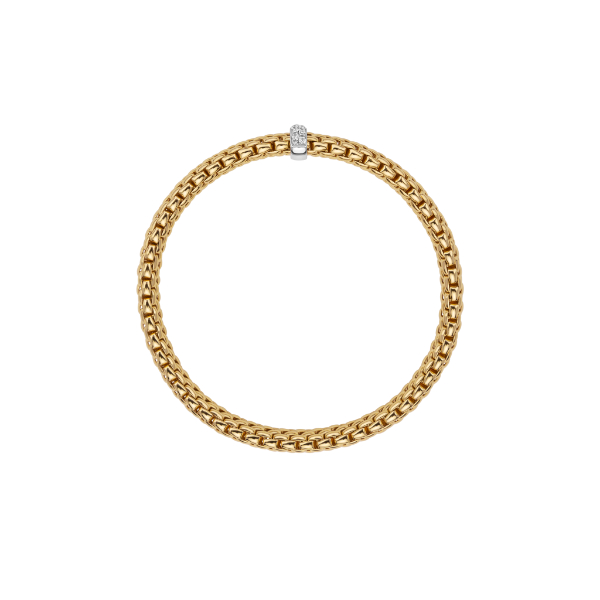 Deze stijlvolle armband van Fope is afgewerkt met diamant in combinatie met 18 karaats geelgoud. Deze armband is beschikbaar in maat; M. De armband is ook te leveren in XS,S,L, en XL.