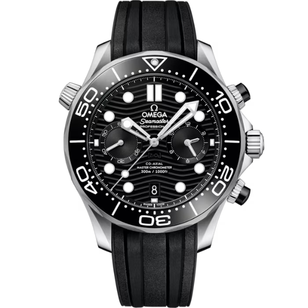 Dit 44 mm chronograaf horloge is gemaakt van edelstaal en heeft een gepolijste zwarte keramische bezel met een witte emaille duikschaal. De pushers zijn ook van gepolijst zwart keramiek, evenals de wijzerplaat met laser gegraveerde golven en een datumvenster op 6 uur. Het horloge wordt gepresenteerd op een rubberen band en wordt aangedreven door de OMEGA Calibre 9900, die te zien is door de transparante achterzijde van dit horloge. Dit model is getest op een waterdichtheid van 30 bar, wat het horloge geschikt maakt om mee te duiken.